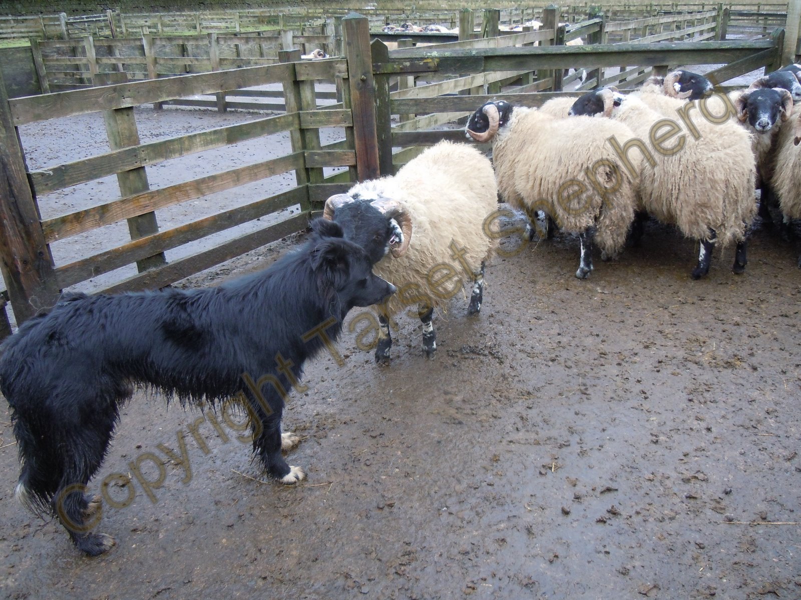 Once again young Kale found himself the dog of the moment, learning the ropes in the pens, teaching the hoggs how to respect a dog at the same time. He was in his element! All other dogs barred up he was having a one to one with me and close encounters with sheep. A happy young dog. He truly did have a close encounter, this one tup hogg seemed to be intrigued by this big black hairy creature which was hanging around, the others weren't too impressed with the idea but this young guy was bolder, going where no tup has gone before! I watched almost spell bound as I really wasn't sure what young Kales reaction would be, he has never had a tup (albeit a tup hogg) come up to him to make friends before, I have to admit I half expected him to have a mouthful of tup but no, he just stood and took it like a man. My imagination started to wander and the more I look at this picture the more I wonder what the young sheep was saying to the young dog. Whatever it was it did the young dog the power of good, he didn't back off with fear, neither did he lurch forward to give fear, he just took the encounter in his stride. I was impressed. Kales reward was to be asked to move the tup hoggs further up the pens, to show his authority, act like a sheepdog, go around the back of them and push them further up to the working pen. A reward which he seemed to appreciate.